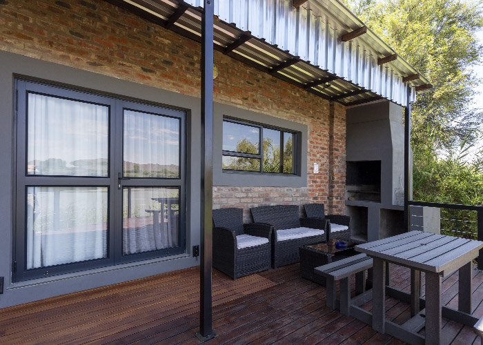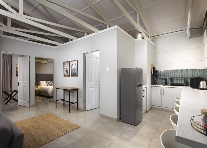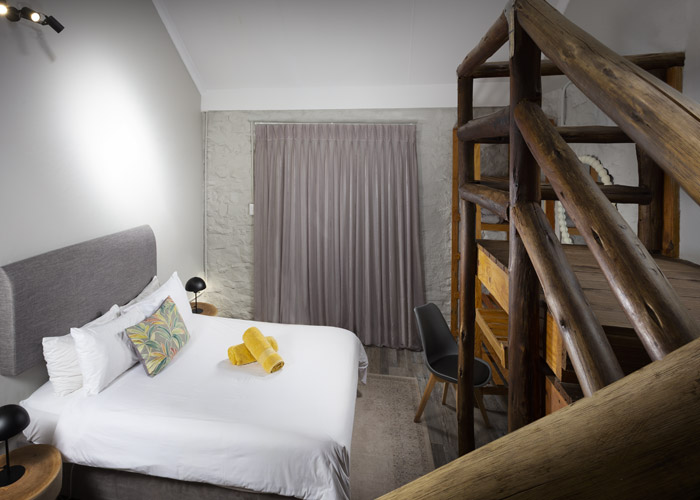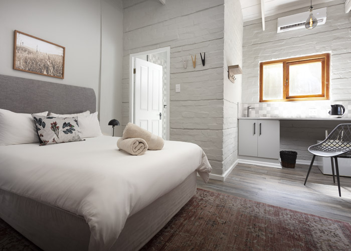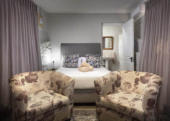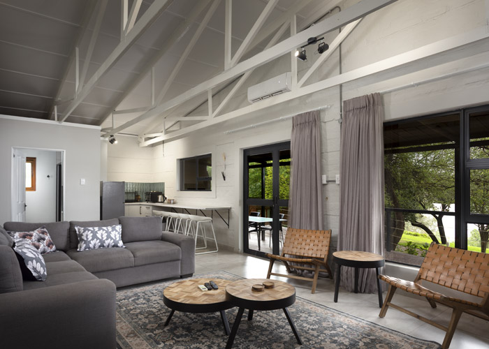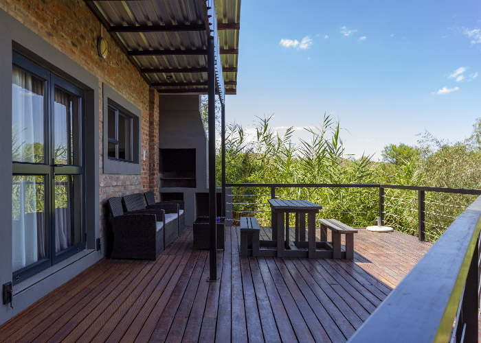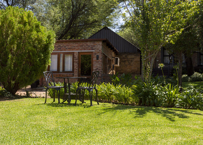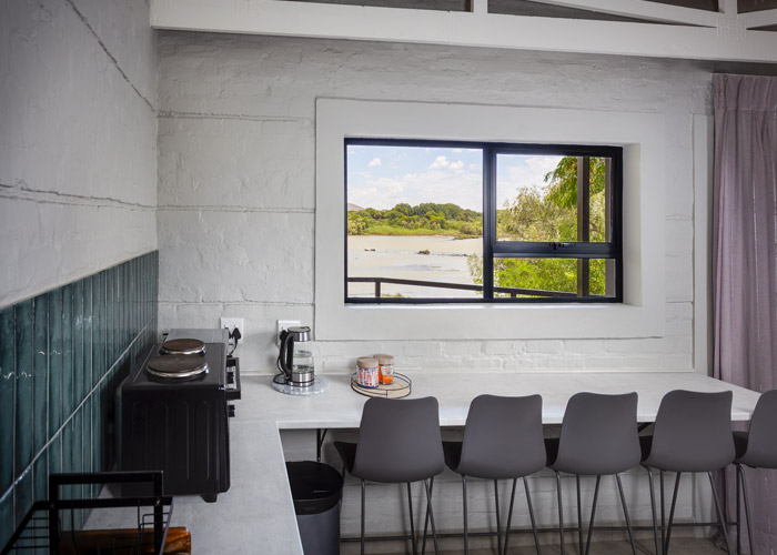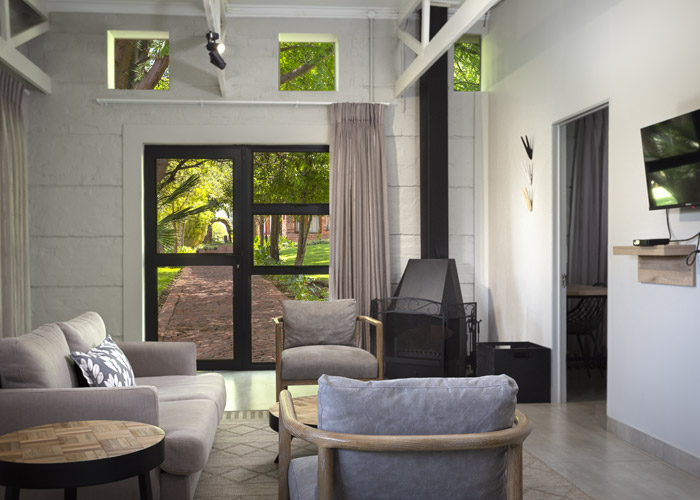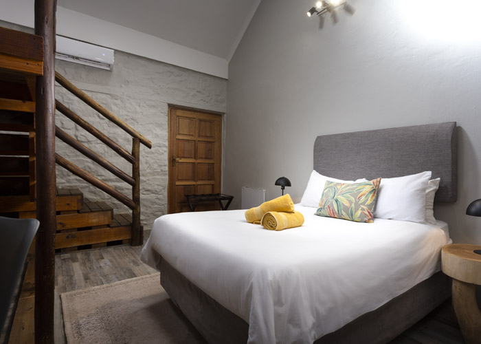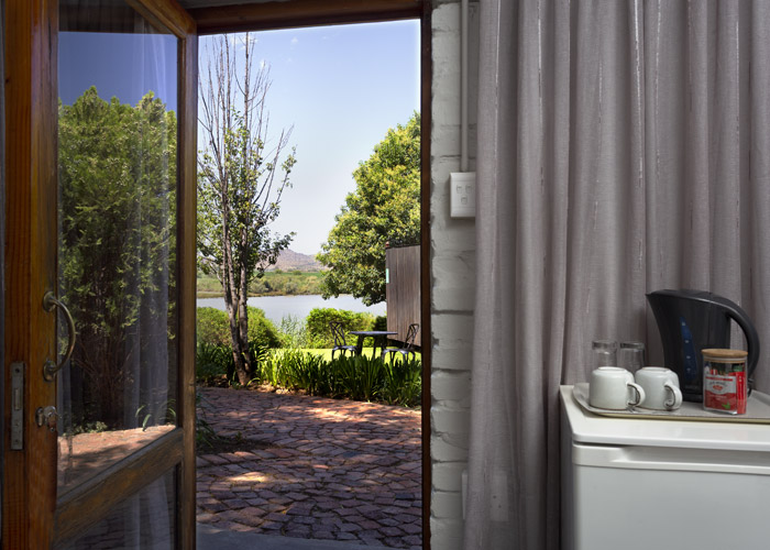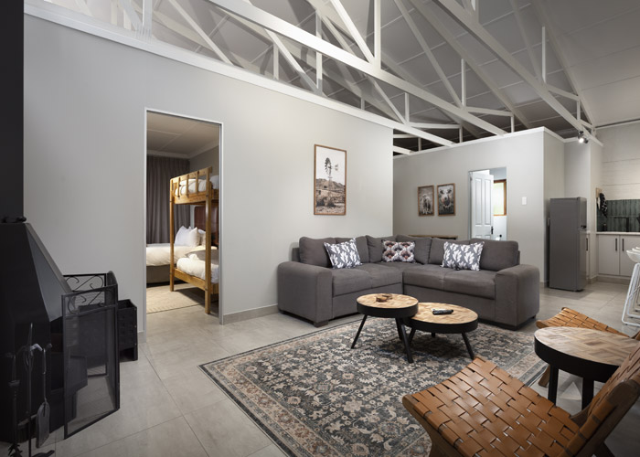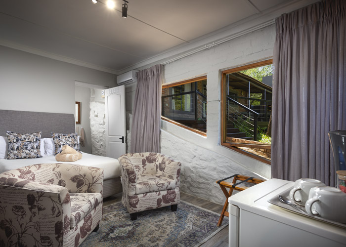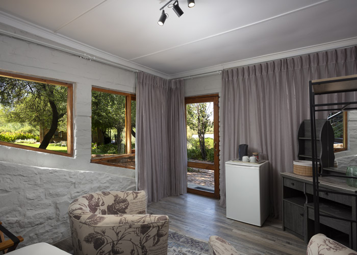 The self-catering units have a spacious open-plan design with a fully equipped kitchen (cutlery, crockery, utensils, microwave, 2 plate stove, fridge, kettle, toaster and basin) and living area. Double doors lead to a private deck with a braai facility. The rooms are equipped with linen, towels, electric blankets (double beds only). The units each have an air-conditioner and fireplace for added comfort.