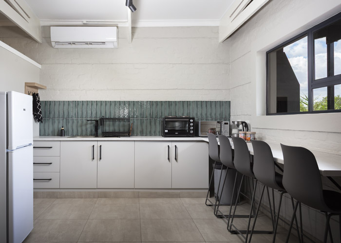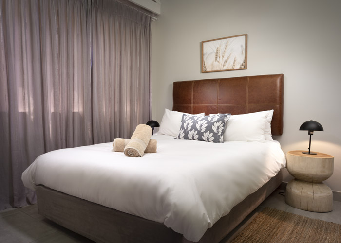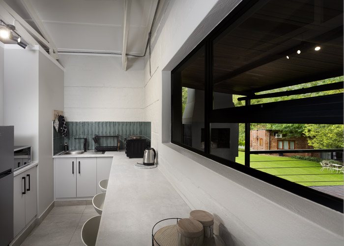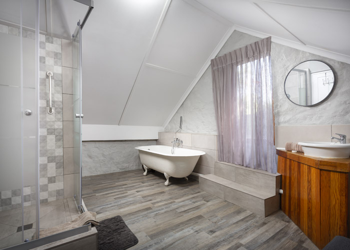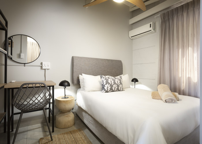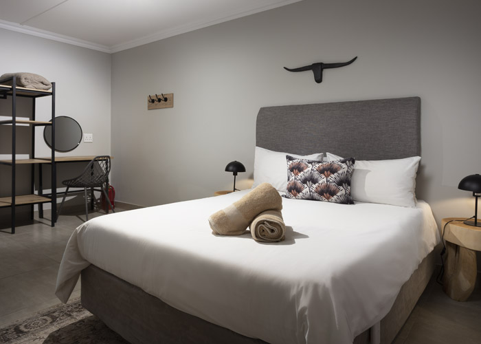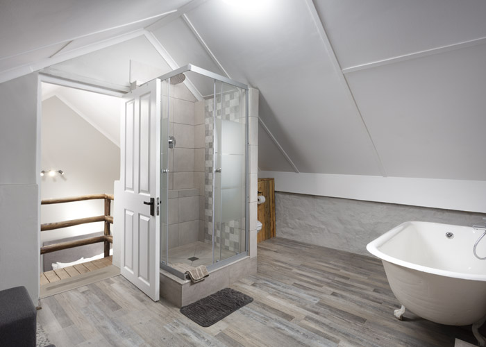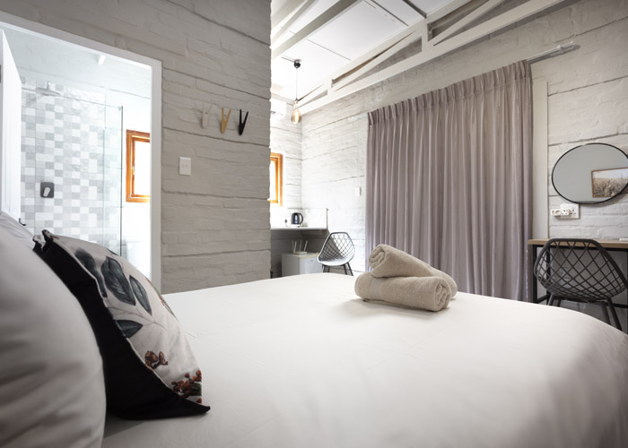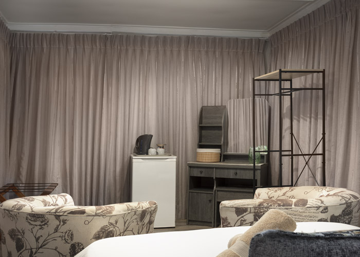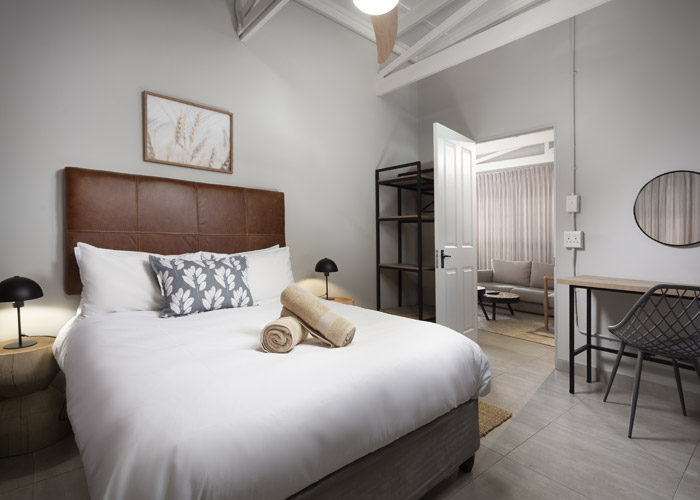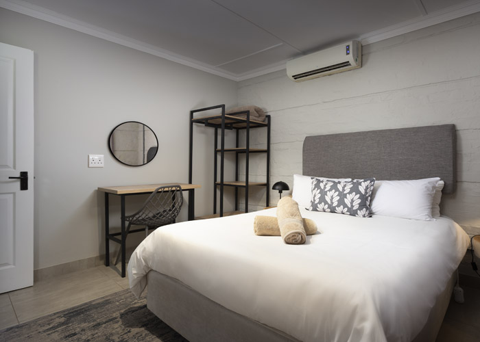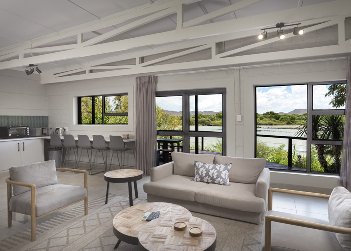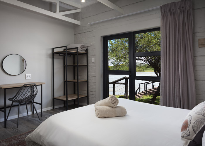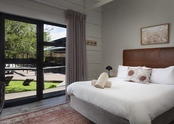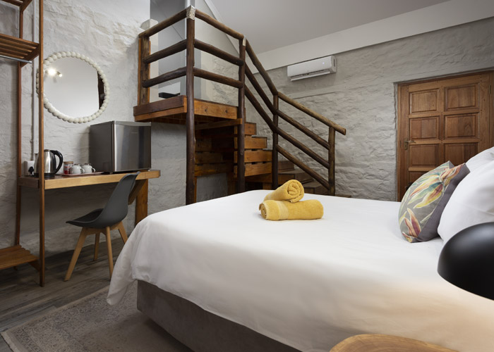 The self-catering units have a spacious open-plan design with a fully equipped kitchen (cutlery, crockery, utensils, microwave, 2 plate stove, fridge, kettle, toaster and basin) and living area. Double doors lead to a private deck with a braai facility. The rooms are equipped with linen, towels, electric blankets (double beds only). The units each have an air-conditioner and fireplace for added comfort.